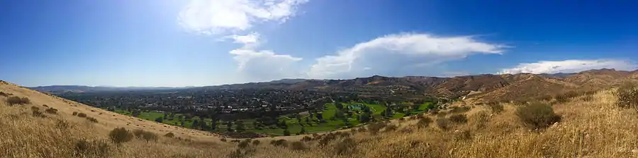 Las Llajas (pronounced YAH huhs)[1] Canyon within the Marr Ranch Parkland contains the 1920s residential subdivision called Marrland and the surrounding open space area administrated by the Rancho Simi Recreation and Park District (RSRPD) and is located in northeastern Simi Valley, CA.[2][3][4][5] The Las Llajas and nearby Chivo Canyons are parts of the Marr Ranch Parkland, Marrland residential subdivision, and are situated at the foothills on the south side of the Santa Susana Mountains.[6][7] It contains panoramic mountain and city views, large oak trees, stream and stream bed, rock formations, barren hillsides and rolling hills.[8] The canyon is visited for recreational activities as rock climbing, biking, hiking, wildlife observation, photography, running, picnicking, and horseback riding. It has smooth footing with many sandy sections and a green creek-bed. It also includes a 46-acre dam that was intended for creation a recreational lake in the 1970s. Now called the Las Llajas Canyon Debris Basin.[9]