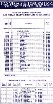 The Las Vegas and Tonopah Railroad was a 197.9-mile (318.5 km) railroad built by William A. Clark that ran northwest from a connection with the mainline of the San Pedro, Los Angeles and Salt Lake Railroad at Las Vegas, Nevada to the gold mines at Goldfield. The SPLA&SL railroad later became part of the Union Pacific Railroad and serves as their mainline between Los Angeles and Salt Lake City.