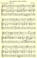 2 and a tempo marking of Largo.[lower-alpha 1] In the first edition published by John Walsh, the orchestration is unspecified,[4] giving only a solo melody line above an unfigured bass line. There is the mention 'violins' at bar 23 where the singer breaks (bar 31 in most modern editions which include an 8-bar introduction). Chrysander claimed[5] to have worked from Handel's 'performance score' and stated that the autograph manuscript had been lost (although RISM state that the British Library hold a fragment of the autograph missing 53 bars);[6] Chrysander's edition shows two violins and a viola with a cello. He does not provide figuring for the continuo. It is not clear whether he invented the additional string parts himself (as he often did) or found them in the performance score to which he referred. Most modern editions seem to be based upon Chrysander's version, as can be seen from the different placement of certain syllables in the melismata in his version and in the Walsh first edition.