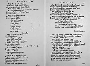 - ↑ The original text by Aaron Hill is drawn from the booklet annexed to Jean-Claude Malgoire's first full recording of Rinaldo, released by CBS in 1977 (see also the reproduction of the 1711 libretto above). The text in rhyme, by Samuel Humphreys, is drawn from the 1731 libretto[10]