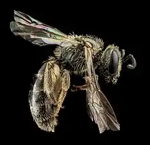 The Gotham bee has a greenish-blue body and brown legs and antennae. Females are 6.1 to 7.1 millimetres (0.24 to 0.28 in) long, about the size of a sesame seed. Males are smaller than females, about 5.26 millimetres (0.207 in) long. The Gotham bee has a wide head (1.73 to 1.87 millimetres (0.068 to 0.074 in) wide versus 1.66 to 1.78 millimetres (0.065 to 0.070 in) long). Males are bluer in color than females which are more green.[1] The Gotham bee can be distinguished from other sweat bees from the pattern of bristles on its abdomen.[2] It most closely resembles Lasioglossum zephyrus and Lasioglossum smilacinae.[1]