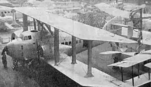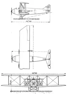 The Latécoère 4 (referred to in the initial contract as the Latécoère IV) was the company's first multi-engined aircraft, the result of a decision that passenger aircraft needed to be designed from scratch rather than modified from military machines.[1] It was a three-engined, two bay biplane with accommodation for 16 passengers. Its wings had neither stagger nor sweep, but had an unusually large interplane gap.[1] The lower wing, which carried dihedral was fixed to the lower fuselage with a thick wing root, but the upper one was high above the fuselage at its centre, supported by pairs of N form cabane struts. The interplane struts were streamlined and broad in chord, made from duralumin; there was a pair of these struts marking the inner bay but a single strut outboard. The wings, made of wood and fabric covered were of constant chord over most of the span, but final sections where the leading edges swept back produced triangular tips. There were balanced ailerons on both upper and lower planes.[1]