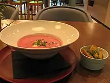 Soups are commonly made with vegetables and broth or kefir. Cold borscht (aukstā zupa), fish soup (zivju zupa), sorrel soup (skābeņu zupa) and mushroom soup (sēņu zupa) are also consumed by Latvians.[3] A traditional Latvian dessert is rye bread soup (maizes zupa) made from rye bread, whipped cream, dried fruit and cranberries.[12]
