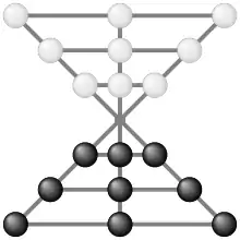 The board consist of two triangles connected together at a common vertex (see diagram). Players play on opposite sides of the board with the base of each triangle forming the first rank of each player. Two lines cross the breadth of each triangle forming the second and third ranks respectively of each player. The common vertex is the fourth rank of each player, and is also the central point of the board. A single line perpendicular to the base of each triangle runs through the common vertex. There are a total of 19 intersection points. Pieces are situated on the intersection points, and move along the lines.