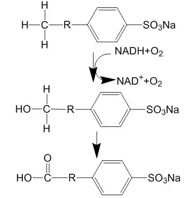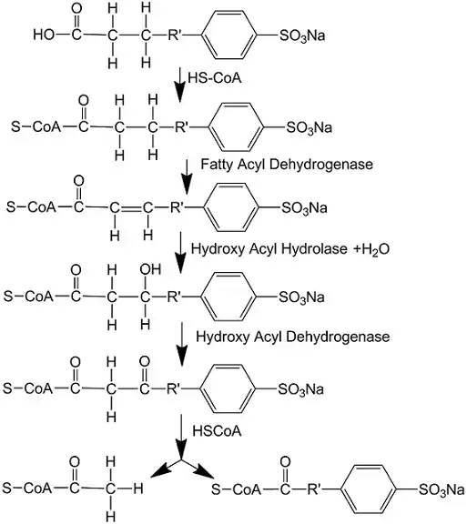 A complete biodegradation under aerobic conditions consists of two steps, primary biodegradation and ultimate biodegradation. The first step begins from the terminal carbon in the alkyl chain as omega-oxidation, which can start from one or both ends, then is followed by beta-oxidation. After the first step the residual is sulfophenyl(di)carboxylates (SP(d)Cs), a large molecule which can be involved in the second step. The second step occurs only when the required bacteria exist. The ring cleavage of benzene and the further desulphonation of the mono- and dicarboxylic sulphophenyl acids happen. After the two-step biodegradation, LAS is degraded into carbon dioxide, water, inorganic salts and residual biomass. During the biodegradation, several specific bacteria and oxygen are required in both omega-oxidation of the alkyl chain and the benzene ring cleaving process, so this biodegradation can only happen in aerobic conditions.[6] In anaerobic conditions in treatment process, LAS shows no change. Researchers also prove that biodegradation process is restricted in 20–40 mg/L and even inhibited at a higher concentration, which leads to the incomplete biodegradation of LAS in sewage treatment plants.[7]