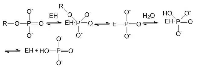Sodium triphosphate, with a formula of Na5P3O10, is a largely used builder in laundry detergents, which can lead to eutrophication caused by phosphorus (P). P is needed for energy transfer, the formation of DNA, RNA and many other intermediary metabolites. Only P in orthophosphate can be assimilated by autotrophs, other P compounds like sodium triphosphate can be chemically or enzymatically hydrolyzed to orthophosphate.[8] The mechanism is shown below.[9]