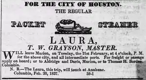 Early in 1837, the original developers of Houston, Augustus Chapman Allen and John Kirby Allen, employed the Laura to demonstrate that Buffalo Bayou was a navigable river as far as their town site. This demonstration voyage also included passengers such as John Kirby Allen, Moseley Baker, Benjamin C. Franklin, and Francis Lubbock. The Laura arrived sometime around January 21, 1837, making it the first steamboat to arrive in Houston.[2] In March 1838, the Telegraph (of Houston) reported that Laura was making regular trips between Houston and Galveston.[3]
