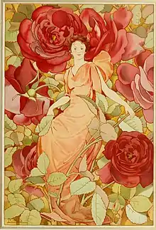 Hills supported herself in part with commercial artwork, painting watercolors for greeting cards and calendars (especially for Louis Prang), drawing patterns for needlework, and decorating pottery.[1][7] Her 1897 calendar Dream Roses—which featured Art Nouveau–inspired images of young women surrounded by masses of flowers—was particularly well received.[11] She also sold illustrations to the children's magazine St. Nicholas[8] and illustrated children's books such as an 1889 edition of Kate Douglas Wiggin's The Birds' Christmas Carol and Anna M. Pratt's Flower Folk. She continued this work even after she was routinely selling out her exhibitions of pastels and watercolors and gaining commissions for her miniatures.[1]