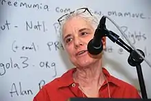 Since her release from prison in August 1999, Laura Whitehorn has been involved in a wide range of causes, including the release of political prisoners.[19] She has contributed writings and art work to numerous books and articles, and has been a guest speaker at several universities, including an official guest of the African American Studies Department at Duke University in 2003, where she was presented as a human rights activist by Duke faculty. A past Senior Editor with POZ Magazine in New York City, much of her writing has to do with supporting AIDS healthcare providers and empowering patients through publications. Whitehorn is a member of the NY State taskforce on political prisoners, a group dedicated to supporting New York State "political prisoners" from the black liberation movement and anti-imperialist solidarity movement.[20] In 2013, Whitehorn along with Kathy Boudin and Mujahid Farid founded the Release Aging People in Prison campaign.[21][22]