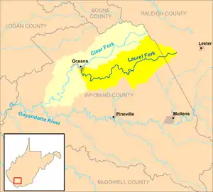![]() The Laurel Fork and its watershed, highlighted within the larger Clear Fork watershed, in Wyoming and Raleigh counties, West Virginia. | |