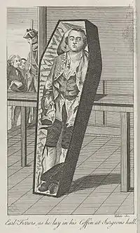 On 5 May 1760, aged 39, dressed in a light-coloured suit embroidered with silver (the outfit he had worn at his wedding), he was taken in his own carriage from the Tower of London to Tyburn and there hanged by Thomas Turlis.[7] There are several illustrations of the hanging. It has been said that as a concession to his rank the rope used was of silk.[3] After the execution his body was taken to the Barber-Surgeons' Hall in Monkwell Street for public exhibition and dissection. The execution was widely publicised in popular culture as evidence of equality of the law, and the story of a wicked nobleman who was executed "like a common criminal" was told well into the 19th century.