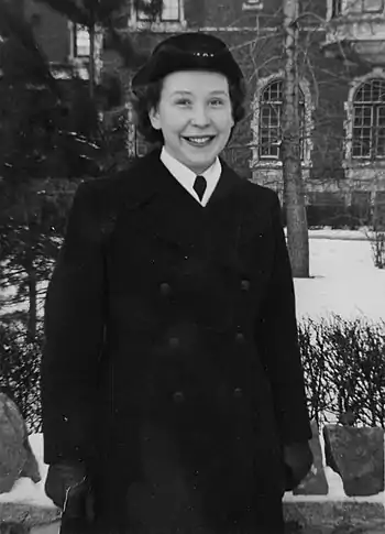Laverna Katie Dollimore was born in Toronto, Ontario on 22 January 1922. Her parents, William Dollimore and Eva Somner, emigrated to Canada in 1915 on the penultimate voyage of the RMS Lusitania. Dollimore was the youngest of three children, preceded by brother, Hedley, and sister, Neysa. She attended Oakwood Collegiate High School and then Western Technical Commercial School for business, graduating in 1938.[1][2]