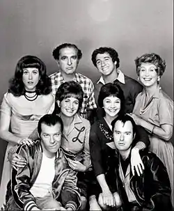 Cast photo, 1976. Standing, L–R: Carole Ita White, Phil Foster, Eddie Mekka, Betty Garrett. Middle row, standing: Penny Marshall, Cindy Williams. Seated: Michael McKean, David Lander.