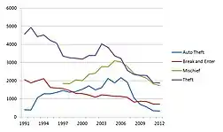 - ↑ Includes all thefts such as over $5,000, under $5,000, possession of stolen goods and fraud. It doesn't include motor vehicle theft however.