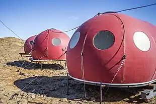 Law-Racoviță-Negoiță is constructed from anti-corrosive and insulating materials - a necessity in Antarctica - with one large laboratory building and five domed red dormitories, a radio station, and a deposit station for combustibles and other waste. The buildings are designed to adapt to the cold environment, fixed to small platforms which may be adjusted by foot, with a minimal impact on the environment. The building which serves as a laboratory is constructed from prefabricated panels, which require a minimum of time to assemble. The dormitories are red and constructed with a fiberglass exterior and polyurethane foam isolation on the interior, and windows constructed from double-paned polycarbonate. All waste produced is deposited in a receptacle evacuated daily by members of the expedition. The base is supplied by electric energy through a small gas generator and a solar panel. The nearby lake contains potable water, and water is also obtained from melting snow. Contact is maintained with other stations via a permanent VHF radio, powered by the solar panel. For contact elsewhere, every expedition has access to a satellite telephone.