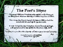 The Poet's stone (grid reference SO5724663535), south-east from Sunny Bank Dingle, is a roadside memorial on Cinders Lane to William Wordsworth, and his wife Mary. Wordsworth was visiting his brother-in-law Tom Hutchinson on 22 October 1845, as part of his exploration of Herefordshire, and rested on the stone. Following this the parish vicar had inscribed the still visible initials 'WW' and 'MW' as memorial to the event.[63][64][65]