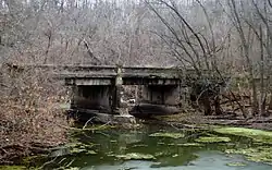 The LeGrand Bridge carried traffic over the Iowa River for more than fifty years. The bridge is a multiple-span reinforced concrete girder construction. This type of bridge construction was typical in Marshall County, Iowa since the Brockway Act of 1913. Marshall county supervisors contracted with Des Moines-based Capital City Construction Company to build the bridge, which was completed early in 1915. The county later rechanneled the river and rerouted the road. The LeGrand Bridge now stands abandoned over a backwater of the river.[3]