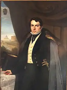 Count Gérard Le Grelle, the son of Joseph J. Le Grelle, was a banker and set up the insurance companies Securitas (1819) and L'Escaut (1821). His situation was hardly comfortable, as the business world was increasingly supporting the Orangism (Dutch Republic) for fear of seeing the Scheldt blocked again by The Netherlands. A supporter of Belgium since his schooling in Brussels with Professor Jean-Baptiste Lesbroussart, Gérard asserted himself, between 1815 and 1830, by categorically refusing any administrative or political office under the Dutch regime and even turning down a proposal to be appointed town councilor.[21] He preferred instead to concentrate his energy on the city of Antwerp and his bank. Together with his brothers Henri (1798-1872)[22] and Edmond (1805-1876),[23] he was a driving force behind the bank,[24] which played an important role in financing the city of Antwerp after the independence of Belgium in 1830. Together with the Rothschild Bank, the Le Grelle Bank was also among the major financiers of the Papal States (which at the time represented a quarter of Italy, from the south of Rome to Bologna) prior to the unification of Italy through the Peter's Pence in 1854 and 1864. Count Gérard Le Grelle's name remains attached to a famous petition for religious freedom in 1825, which earned him Rome's support in 1852.