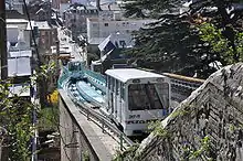 Declared to be in the public interest on 23 April, 1889,[36] and opened for service on 17 August, 1890,[36] this 343 m-long railroad, 145 m of which was viaduct track, was served by 2 cars with 48 seats, making the journey in 3 minutes.[37] In 1911, in view of the company's popular (600,000 passengers a year) and financial success,[37] it was decided to replace steam traction with electric traction. The inter-war period confirmed this success, with over 2 million passengers being transported annually in higher-capacity cars.[36] Indispensable to the local population, from 25 July, 1945 the funicular was operated directly by the town,[38] which decided to modernize it at the end of the 1960s. After extensive work between 1968 and 1972, a modern funicular was made available to the people of Le Havre.[39] New two -wheelset cars with pneumatic tires running in U-shaped[36] sections were put back into service, much to the delight of schoolchildren, the main users of this mode of transport, so rare in the north of the country. In 2021, Le Havre's funicular was completely renovated and rebuilt.