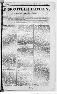 - ↑ "Le Moniteur haïtien : journal officiel de la république d'Haïti, paraissant tous les samedis - 14 Years available - Gallica". gallica.bnf.fr (in French). Retrieved 2020-02-07.