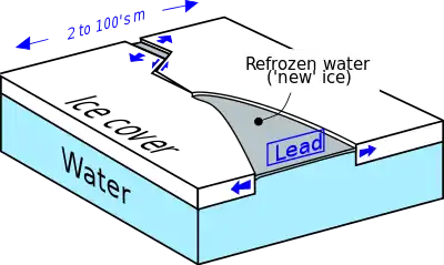 A lead (/ˈld/, rhymes with "reed") is a large fracture within an expanse of sea ice, defining a linear area of open water that can be used for navigation purposes.[1][2][3] Leads vary in width from meters to hundreds of meters.[4] As is the case for polynyas (another sea ice feature involving open water), leads allow the direct interaction between the atmosphere and the ocean, and are important for Arctic sea ice ecology. Additionally it has been lately found that ice leads contribute significantly to the amount of mercury deposited onto surface and leaked into the ocean.[5] If the air is cold enough (typically in the winter), the water within a lead quickly refreezes, such that in many cases, leads are partly or entirely covered by a thin layer of new ice.[6]