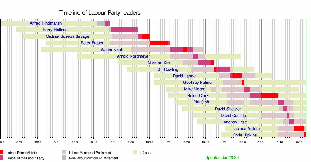 The post of leader of the Labour Party was officially created upon the party's inception in 1916, though the title "leader" was often substituted and/or complemented with the title "chairman".[1] At the 1935 election, Michael Joseph Savage led the Labour Party to victory, becoming the first Labour prime minister. In 1963, Arnold Nordmeyer became the first New Zealand-born leader of the party; three previous leaders had been born in Australia and one each in England and Scotland. The most electorally successful Labour leader to date is Helen Clark, who won three elections, in 1999, 2002 and 2005. Clark is also the party's longest-serving leader, having served for 14 years, 346 days between 1993 and 2008.[2] Peter Fraser is the longest-serving Labour prime minister, serving 9 years, 261 days between 1940 and 1949.