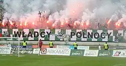 The fans have a friendship with Śląsk Wrocław with which the two clubs fans have had a friendship since 1977, and have had friendly relations since 1967. This is the oldest fan friendship in Polish football.[63][64] During the 2017/18 season, the two sets of fans celebrated their 40th Friendship Anniversary. Games between the two are often called "The Friendship Match".[65][66]