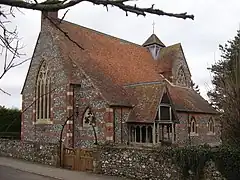 The Church of England parish church of St James, built in 1859 of brick and flint, is towards the southern end of the village. It was designed by architect, Samuel Sanders Teulon.[16] The interior is brick with patterns formed by the use of differently coloured brick courses and complementary colour stone embellishments. Leckhampstead has a village hall used for voluntary and social gatherings. The one public house in the village, The Stag, closed in 2017. Leckhampstead War Memorial is sited on the triangular village green. It comprises an obelisk on a plinth with two clock faces, one facing north and one facing south, which incorporate various types of ammunition in them. The surrounding chains are from a battleship that took part in the Battle of Jutland and they are supported on spent shell cases.[17] It was given Grade II listed status in May 2016, legally protecting it from unauthorised modification or removal.[18]