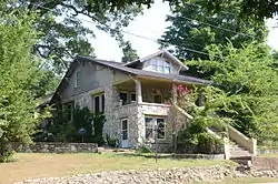 The Lee Weaver House is a historic house at the northwest corner of Main and Cope Streets in Hardy, Arkansas. Built 1924–26, this 1+12-story stone structure is a fine local example of the Bungalow style. It is fashioned out of native rough-cut stone, joined with beveled mortar. It has a side gable roof with a shallow pitch, and extended eaves with exposed rafter ends and knee braces. A wide gable-roof dormer with three sash windows pierces the front slope. The roof shelters a front porch supported by tapered square columns.[2]