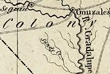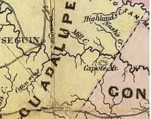Leesville is an unincorporated city of 384 residents distributed over 51 square miles in the Gonzales—Guadalupe County area in Texas, United States, electorally known as local Precinct 13;[22] defined by the south of its Capote Hills ("El Capote Ranch")[23] at the "Leesville Quad" intersection[24] (Farm to Market Road 466 / Texas State Highway 80) and the north of Sandies Creek (Farm to Market Road 1117 / Texas State Highway 80 / Texas State Highway 97), twelve miles southeast of Seguin.[25] Beginning in the 19th-century, the municipal identity of Leesville was founded upon being one of the first Justice of the Peace Precincts[14] of its original county-area, as prescribed in the Texas Constitution; as well as once generally serving as the primary seat of a former Texas House District 90, once rated at more than 1,000 constituents.[15][16] Straddling and nearing the southeastern border of Guadalupe County, the real estate origins of Leesville go back to the 1800s survey-plots[4][3] of Texas Revolution figures Ezekiel Wimberly Cullen[26] (late owner of Sandies Creek) and Count Joseph de la Baume of France (late owner of Capote Hills); the latter retaining Texas's founding father Stephen F. Austin as an attorney, to reacquire the early-1800s Spanish land-tract, after Mexico's Independence from Spain in 1825.[27] Divided by Farm to Market Road 1682 joining with Gonzales—Guadalupe County Road 121 West, Leesville's northern territory is closest to the Austin Metropolitan Areas through Texas State Highway 80 / U.S. Route 183 in Texas, while the southern territory is closest to the San Antonio Metropolitan Areas through Texas State Highway 97 / U.S. Route 87 in Texas.