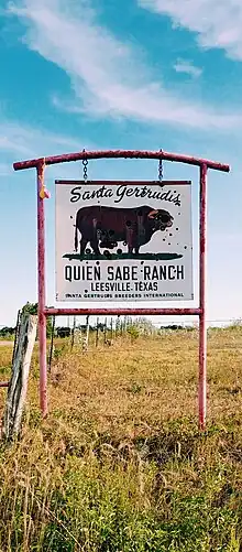 - Quien Sabe Ranch (Pioneer Santa Gertrudis Breeder);[87][88] as late as 1954, this ranch has utilized a foundation stock of cattle from the herds of Richard King and a “John Martin,” claiming all to be from King Ranch Running W Bull lineage[89]