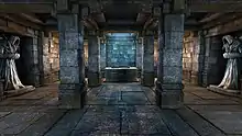 Eventually the party reaches the bottom level, signposted as "Prison". Inside, the source of the voice guides the player to reconstruct a broken machine which will activate a portal out of the dungeon, however upon assembling the parts and repairing it, the voice is revealed to be the machine itself, which manifests as a giant mechanical clockwork cube which attempts to crush the party. Escaping through a portal, the party locates the tomb of the creators of Grimrock Dungeon, who left behind scrolls explaining the dungeon's purpose of containing the machine, which they refer to as "the Undying One", until "the gears of time finally come to rest". The tomb also contains a weapon designed to be used in the event of the Undying One's escape from confinement.