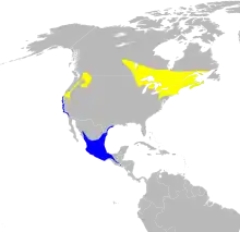 Nashville warblers breed in two distinct areas, one in Canada and the northeastern United States, and another in the western United States. The northeastern part of its range extends from Côte-Nord and Cape Breton Island in eastern Canada to central Alberta. For the most part, it only breeds between about 52 and 45.5 degrees north, but it is also found less commonly in the Appalachians of Pennsylvania and West Virginia. Although named after Nashville, Tennessee, the Nashville warbler only visits that area during migration. They migrate to southernmost Texas and California, mid-Mexico, and the northernmost parts of Central America (Guatemala and El Salvador) in winter. In their breeding range, they prefer open mixed woods and bog habitats.[8]