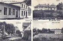 Lejkowo (German: Leikow),postcard sent on May 21, 1928. From the top: Karl Hasse Inn; School; Village road; View from the nearby hill. Publisher:Photograph Georg Schier.