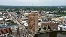 Leland Tower is a twenty-two-story building on Stolp Island in Aurora, Illinois. Leland Tower was at one point the tallest building in Illinois outside of Chicago. Stolp Island is recognized as a Historical District by the National Register of Historic Places.
