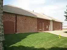 The hip roof is clad in asphalt shingles while the wooden soffits have been covered with aluminum, another of the alterations through the years.[1] The original structure featured doors and windows that have since been bricked over and altered. From east to west on the original south elevation was a 7.5 feet (2.29 m) by 10 feet (3.05 m) doorway, four windows, a doorway, another door, and two windows.[1] The north and west facades had two windows and the south elevation another large doorway. In 1978 Pierce Construction of Lena was hired to completely or partially brick over all doors and windows on the building. A new windowed, wooden door was installed in a new opening on the east facade of the Electric Plant.[1]
