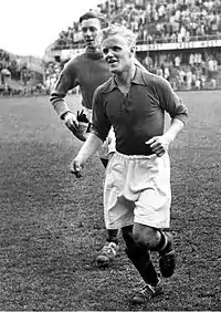 After the successful start in Italy, Skoglund soon established himself as a key player at Inter Milan as the club won the Serie A in both 1952–53 and 1953–54. During the latter season, Skoglund provided three assists as István Nyers scored a hat-trick in a decisive title winning game against rivals A.C. Milan.[13] Skoglund also enjoyed a fruitful partnership with strikers Benito Lorenzi and Faas Wilkes during Inter Milan's league winning seasons.[14][5] Manager Alfredo Foni, appointed in 1952, had adopted a highly defensive approach with the Swede being an essential part of the team's attacking force from his left wing.[6]