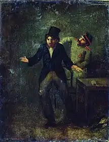 His paintings mostly dealt with the lives of ordinary people. Perhaps his most popular painting was one of ostentatiously pious policemen who went to the house of a merchant at Christmas to "glorify Christ" and get a tip.[2] It was copied and reproduced many times, by himself and others, although the original has been lost. In fact, he often made several copies of his paintings (with variations), and most of them were small, to make this easier.