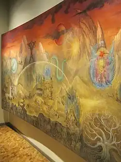 After spending part of the 1960s in New York City, Carrington lived and worked in Mexico once again.[7] While in Mexico she was asked, in 1963, to create a mural which she named El Mundo Magico de los Mayas,[27] and which was influenced by folk stories from the region.[28] The mural is now located in the Museo Nacional de Antropología in Mexico City.