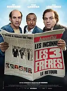Les Trois Frères, le retour (English: The Three Brothers are back) is a 2014 French film written, directed by and starring Didier Bourdon and Bernard Campan alongside their Les Inconnus partner Pascal Légitimus. It is the sequel to the blockbuster film Les Trois Frères.
