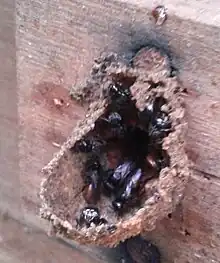 Lestrimelitta is a genus of stingless bees found in the Neotropics, from Mexico to Brazil and Argentina, with about 20 known species.[1] They are small, shining black species from 4 to 7 mm in length, with rounded heads and reduced pollen baskets. Unlike most eusocial bees, they do not gather their own pollen and nectar from flowers, thus are not pollinators, but instead they invade the colonies of other stingless bee species and rob their pollen and honey stores (a phenomenon called "cleptobiosis").[1] They do not initiate their own nests, but they will "evict" another stingless bee colony from its nest (usually in a tree cavity), and convert the pre-existing nest to house their own colony.