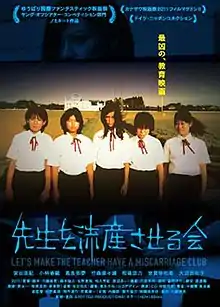 Let's Make the Teacher Have a Miscarriage Club (先生を流産させる会, Sensei wo Ryūzan Saseru Kai)[2] is a 2011 Japanese thriller film directed by Eisuke Naitō in his directorial debut.[3] The film follows a group of five junior high school girls led by a psychopath who decide to make their teacher have a miscarriage after hearing the news of her pregnancy.
