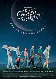 Let Me Be Your Knight (Korean: 너의 밤이 되어줄게) is a South Korean television series directed by Ahn Ji-sook and written by Seo Jeong-eun and Yoo So-won. Starring Jung In-sun along with members of fictitious band Luna: Lee Jun-young, Jang Dong-joo, Kim Jong-hyun, Kim Dong-hyun and Yoon Ji-sung, the series depicts a romance between a world star idol suffering from sleepwalking and a resident doctor who has to secretly treat it.[1] The series premiered on SBS TV on November 7, 2021, and aired every Sunday, at 23:05 (KST) till January 24, 2022.[2] It is available for streaming on iQIYI in selected territories.[3]