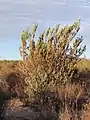The shrub grows 3 m (9.8 ft) tall and flowers in August. The plant dies in a fire but the seeds survive. The seeds are stored in a toll on the female plant and fall to the ground after a fire and are spread by the wind, the seeds have wings. The plant is unisexual and there are separate plants with male and female flowers, which are pollinated by insects. The plant's national number is 81.2.[2]