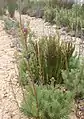 The shrub grows 5 m (16 ft) tall and flowers from December to January. The plant dies after a fire but the seeds survive. The seeds are stored in a toll on the female plant and fall to the ground after a fire, possibly spreading by the wind. The plant is unisexual and there are separate plants with male and female flowers, which are pollinated by the wind.