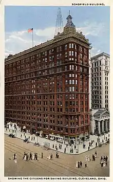 In 1901, Scofield began construction of the Schofield Building, a 14-story structure that would serve as the headquarters of his architectural firm. During construction, a worker named William O’Neal was injured when a wall collapsed, burying him. Scofield was arrested on September 16, 1901, for violating local building codes which lead to the unsafe conditions that caused O'Neal's injury. He was later acquitted due to insufficient evidence.[6] In October 1901, a man fell from the building. Scofield was not arrested due to the intervention of Cleveland mayor Tom L. Johnson who suggested the contractor be arrested instead.[6] Upon completion, Scofield's office was located on the Northwest corner of the building on the top floor which allowed him to look down across Euclid Avenue towards the completed Soldiers' and Sailors' Monument in Public Square.[1] The building's red terra cotta facade was modernized in 1969 with a steel and enamel facade. The building was restored in 2019 for around $50 million which included the removal of the modernized facade.[7] The building now serves as the Kimpton Schofield Hotel and the Schofield Residences.