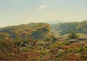 Lewis Herzog travelled extensively, visiting London, Rome, Berlin and Munich, until 1888, when he enrolled at the Kunstakademie Düsseldorf. There, he studied with Heinrich Lauenstein, Adolf Schill, Hugo Crola, Johann Peter Theodor Janssen and the engraver, Carl Ernst Forberg.[2] From 1891 to 1893, he was in the master landscape class of Eugen Dücker.[3] Upon graduating, he took a long study trip to Venice with his friend, Alfred Sohn-Rethel. In 1897, he participated in the Venice Biennale.[4] Unlike his father, whose landscapes largely remained in the classical Dusseldorf and Hudson River School tradition, Lewis incorporated a more impressionist style.