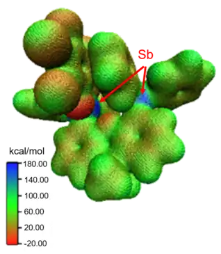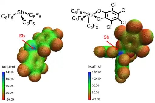 Partial positive charges on the surface of antimony compounds interact with partial negative charges. For example, Sb(C6F5)3(o-O2C6Cl4) has a more positively charged site than Sb(C6F5)3 as shown in its electrostatic potential map, corresponding to higher Lewis acidity (the FIA of Sb(C6F5)3(o-O2C6Cl4) and Sb(C6F5)3 are 116 and 89 kcal/mol, respectively).[7]