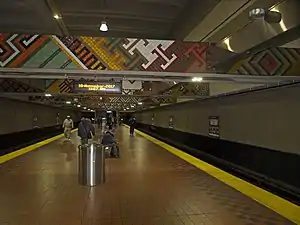 The concrete beams above the station platform are decorated with a ceramic mosaic created by Baltimore artist Patricia Alexander for a commission of $68,300.[3][4]