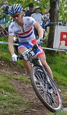 He competed once more for the British team at the 2008 Summer Olympics in Beijing, and was considered one of the favourites for the gold medal.[5] Only 150 metres (490 ft) into the race,[2] his handlebars clipped a race marker, flipping him over the bars and off the bike. This left him in last place chasing the rest of the pack, but he managed to move up to seventh place by the finish.[5] He did not get the chance to defend his gold medal at the 2010 Commonwealth Games as mountain biking had been dropped from the games, replaced by archery in the schedule. He considered a switch to road racing to take part in the Games.[7]